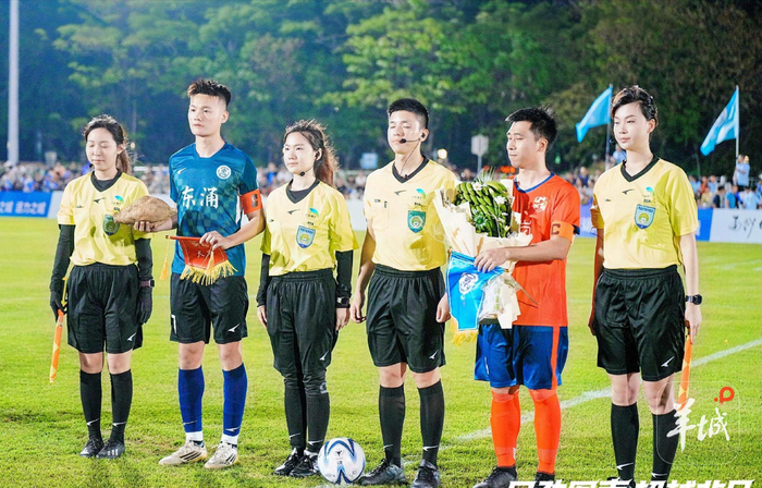 南沙区委副书记麦洁萍用粤语宣布联赛开幕后,20时揭幕战在东涌镇水乡队与大岗镇足球队之间正式打响。比赛开始前,双方队伍先完成了一次别开生面的交换礼物环节。东涌镇递上一串佳丽蕉,用粤语谐音“招”邀请对手接招;大岗镇则回赠本地产的粉葛,同样以“葛”谐音“割”,寓意收割胜利,这一环节引得看台笑声不断,也成为社交媒体上的即时话题。